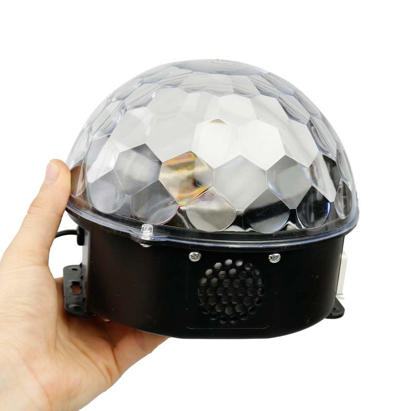 لامپ LED مدل Magic Ball به شکل توپ شیشه ای و بسیار شیک طراحی شده است که همراه با رقص نور زیبا از پخش موسیقی باکیفیت صدایی مناسب نیز برخوردار می باشد. این چراغ نور موزیکال به صورت بی سیم توسط بلوتوث به گوشی موبایل، تبلت و دیگر دستگاه ها به سرعت جفت می شود، همچنین پورت USB نیز برای آن تعبیه شده که با اتصال فلش مموری می توانید به آرشیو آهنگ ها و دیگر فایل های صوتی نیز به راحتی دسترسی داشته باشید. بلندگوهای قدرتمندی برای این لامپ LED بلوتوثی درنظر گرفته شده که صدایی رسا و استریو با بیس عالی را به گوش می رسانند و همراه با رقص نور به خصوص در محیط های تاریک و نورافشانی های دلنشین بر روی دیوار جذابیت آن را دو چندان نشان می دهد. منبع انرژی این چراغ LED بلوتوثی و فلش خور از طریق برق شهری با ولتاژ ورودی 100 تا 240 ولت تامین می شود و یک ریموت نیز همراه آن قرار دارد که مدیریت رقص نور، پخش موسیقی، حجم ولوم و … از راه دور نیز برای کاربر امکان پذیر باشد.